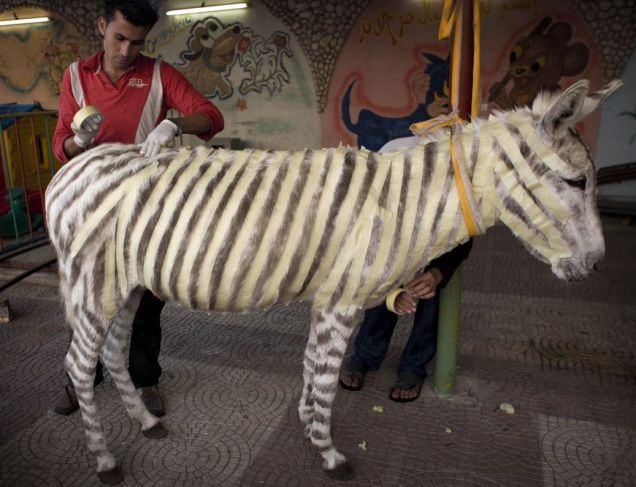 a palestinian donkey is being taped up and spray painted so as to look like a zebra for eid al – adha festival. pretty funny eh? but then take a moment to consider the surrounding factors and your reactions may start to differ.